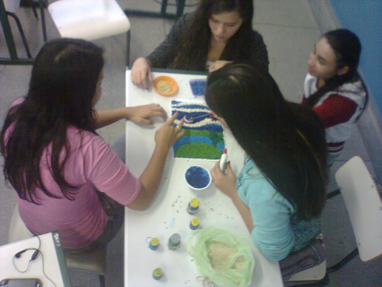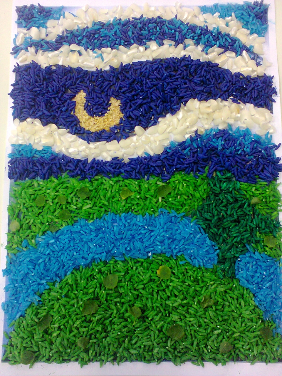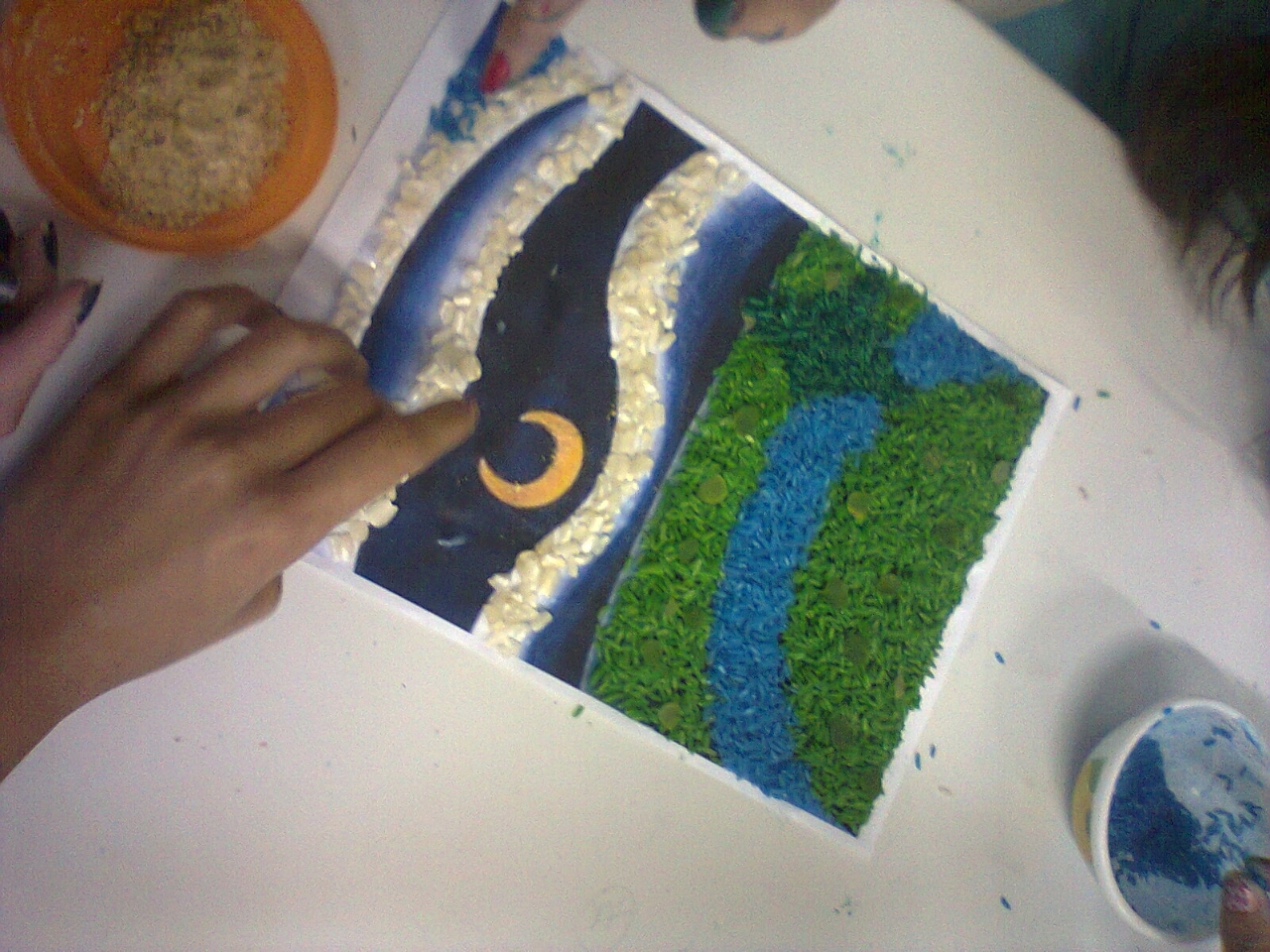 Procedimento : Primeiro escolhemos a obra de A lua,escolhemos os materias necessarios,tingimos o arroz e colocamos sobre a obra.