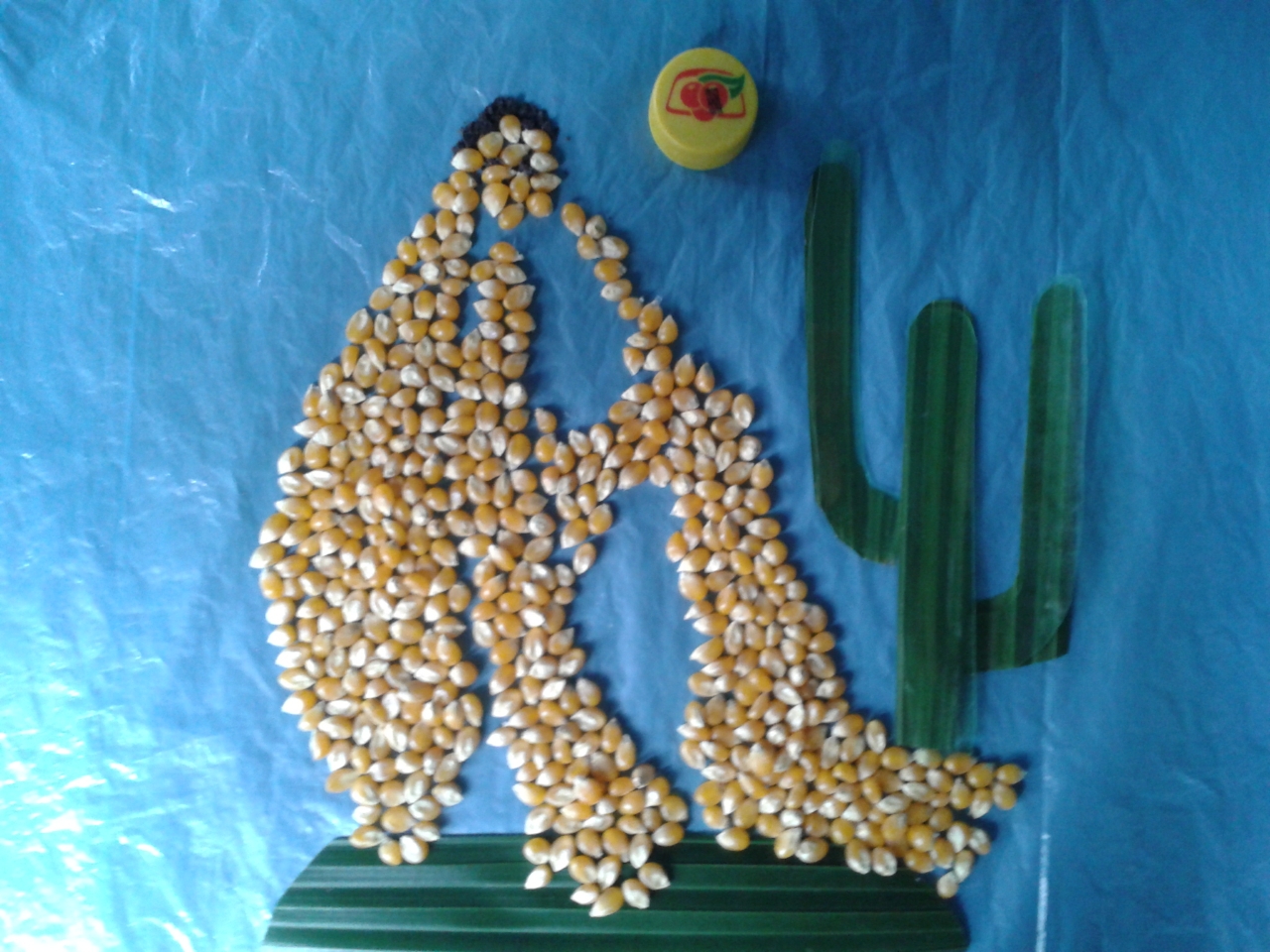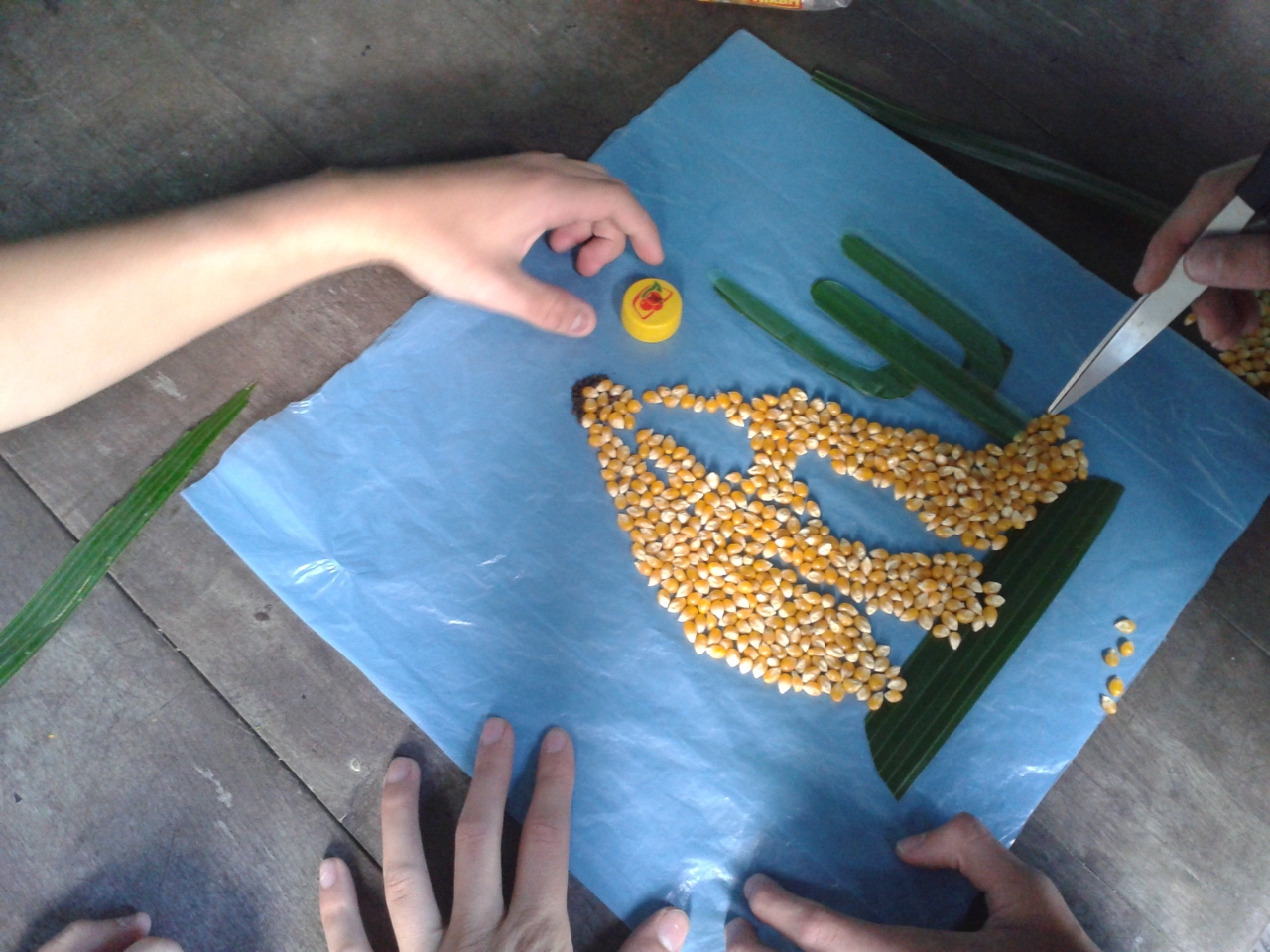 Procedimento: Foi posto a sacola plástica sobre a mesa e após isso espalhado grãos de milho até uma imagem semelhante a obra de Abaporu. Após esse processo, foram colocado os outros materiais, para lembrar a paisagem, como por exemplo o cacto e o sol.