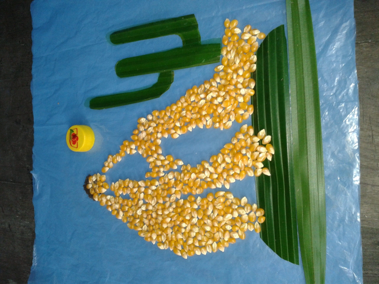 Materiais : Milho de pipoca, carvão, terra, folhas, sacola plástica (azul), garrafa pet (verde), tampinha de garrafa pet.
