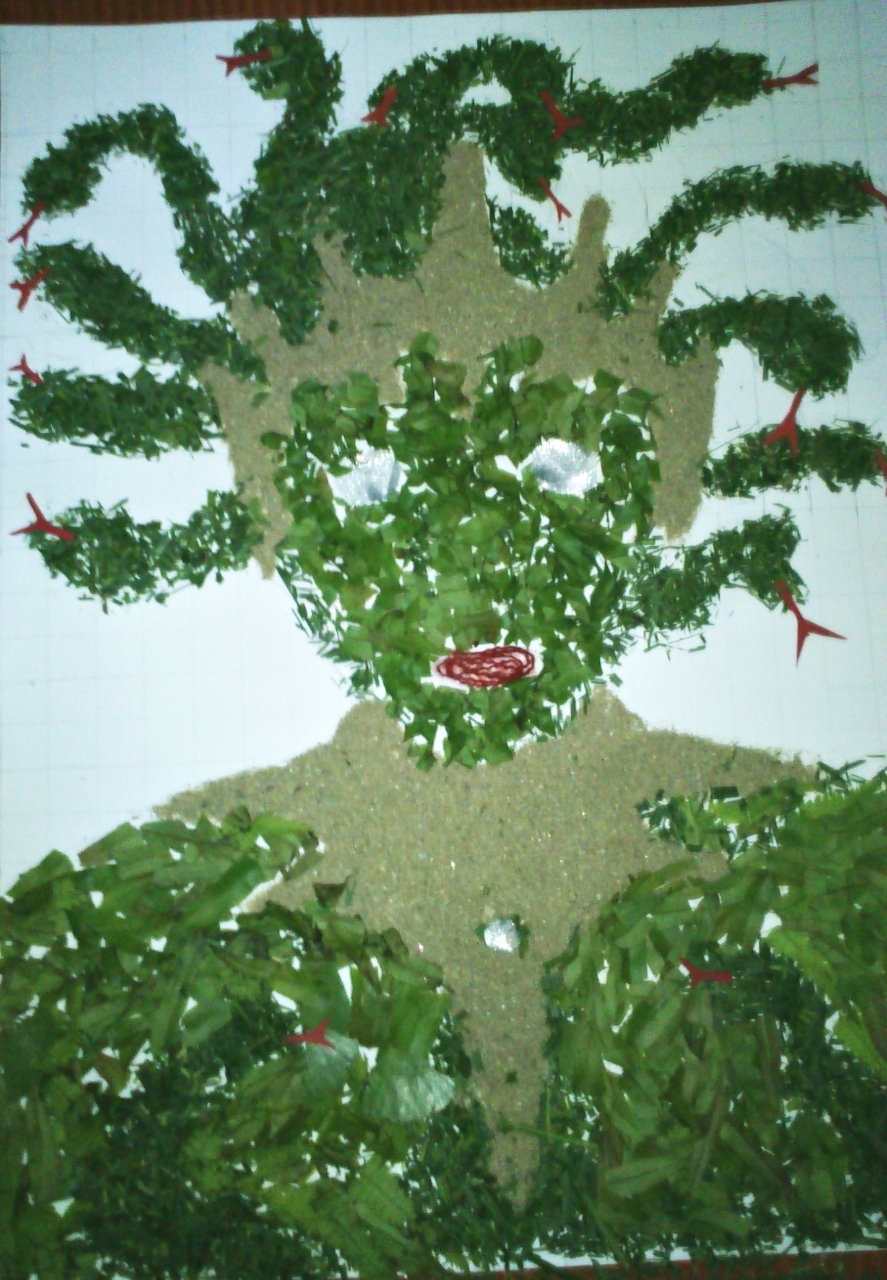 A areia foi utilizada para a coroa e o colar da Medusa, usamos o mato e as folhas para fazer sua pele e a pele das cobras, em seguida, colocamos as linguas feitas de EVA para dar formato as cobrase , por fim, tiramos a foto.